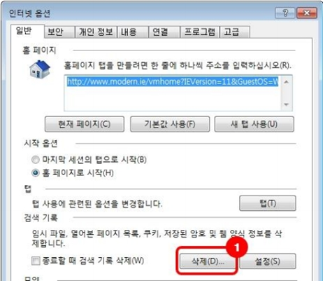 4. 인터넷 옵션 창 > [일반] 탭 > 검색 기록 > 삭제를 클릭
