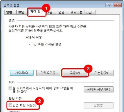 4. 팝업 차단 사용 체크해제 후 고급을 클릭