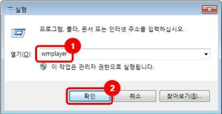 4. 실행 창에서 wmplayer을 입력 후 확인을 클릭하여 Windows Media Playr(이하 WMP)를 실행