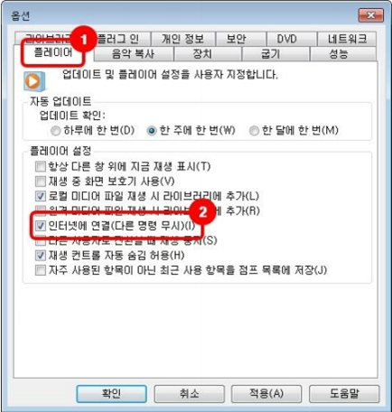 6. [플레이어] 탭에서 인터넷에 연결(다른 명령 무시) 체크